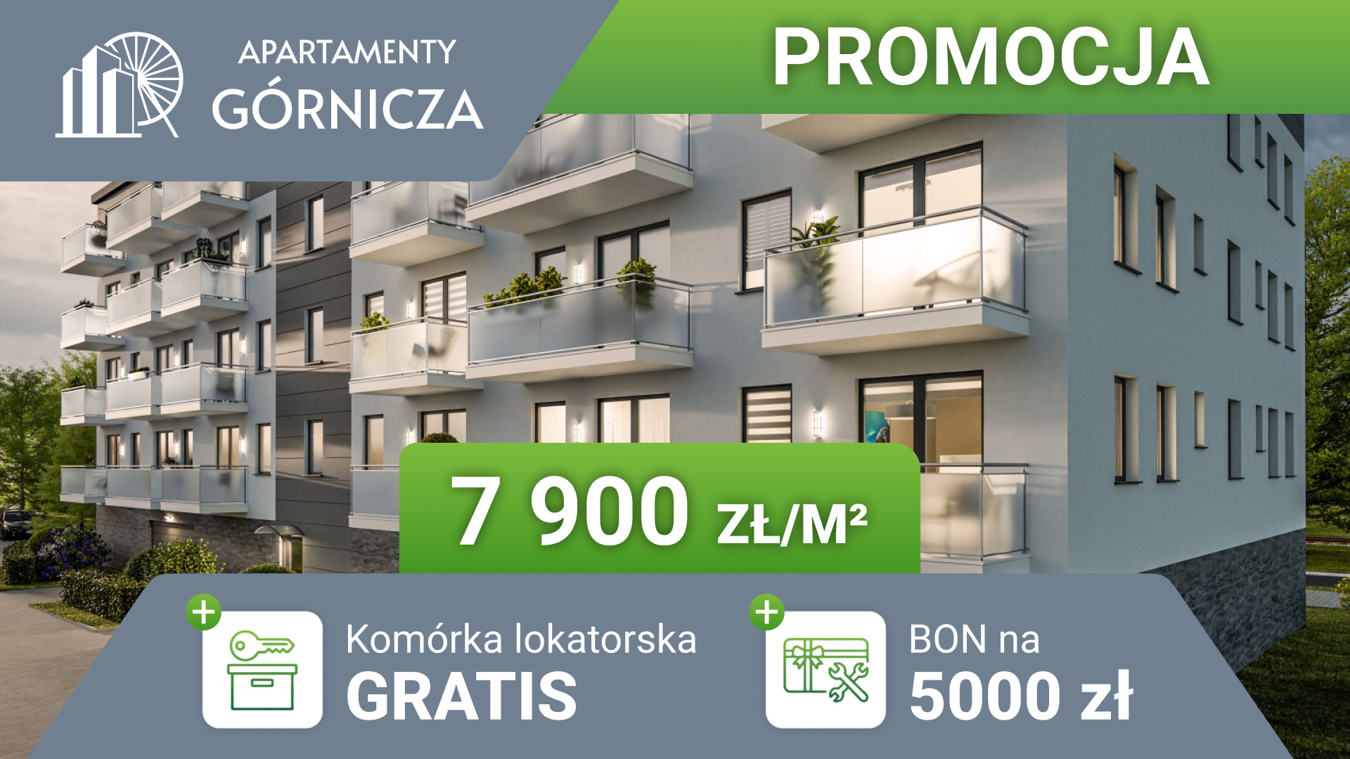 Promocja 7 900 zł/m² + komórka lokatorska GRATIS + BON do wykorzystania dotyczy wybranych lokali w inwestycji Apartamenty Górnicza: